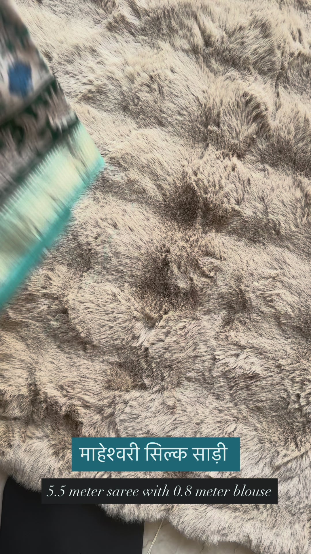 Grace woven in tradition — this 5.5-meter Maheshwari silk saree features hand block-printed floral motifs in serene blue hues, paired with a contrast green zari border. Comes with a 0.8-meter matching blouse piece.