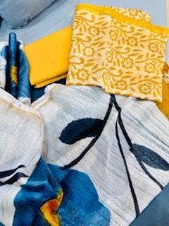 Unstitched chanderi silk suit set, featuring rich mustard golden block prints with a contrast floral blue silk dupatta. The set includes a pure chanderi silk top, a matching santoon bottom, and a luxurious Chanderi silk dupatta with intricate flowers and vibrant golden borders.